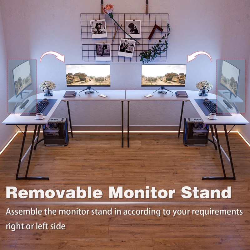 This L-shaped gaming desk and office desk has a spacious desktop that can meet various forms of use. Whether you use it to play computer games or use it for office work, this durable wooden table top will satisfy. The L-shape can be well adapted to the corner of any room to save space. The spacious desktop is large enough for all of your electronic devices, and the removable monitor stand can be installed on either the left or right side, letting every gamer get the absolute best viewing experience.