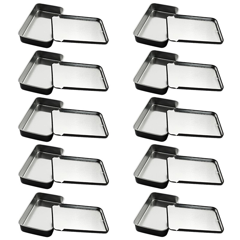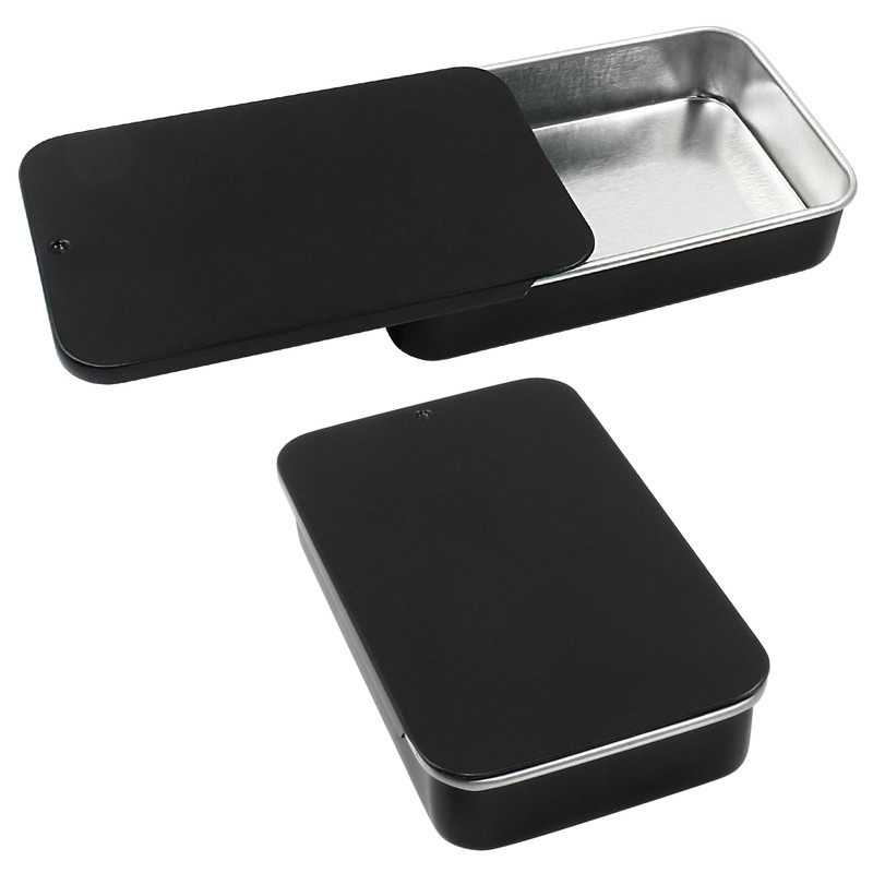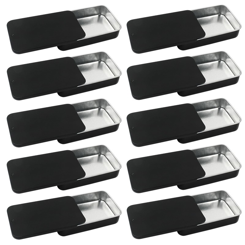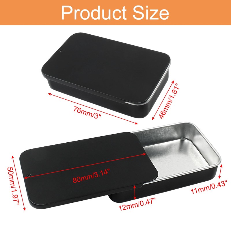 - 【What Will You Get】: 10 x Black Sliding Top Tin Containers;Product Total Size: 3.14 x 1.97 x 0.63” / 80 x 50 x 16mm (L*W*H). Inner Size: 3 x 1.81 x 0.59” / 76 x 46 x 15mm (L*W*H).It is your best choice for storing small items.
