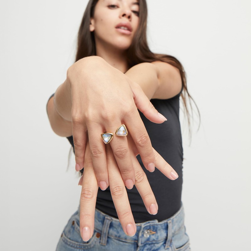 - Spezielles Design und Handwerkskunst: 18 Karat vergoldeter dreieckiger Ring mit zwei mehrfarbigen Kristallen, hergestellt in Spanien unter Verwendung eines 100% handwerklichen Verfahrens