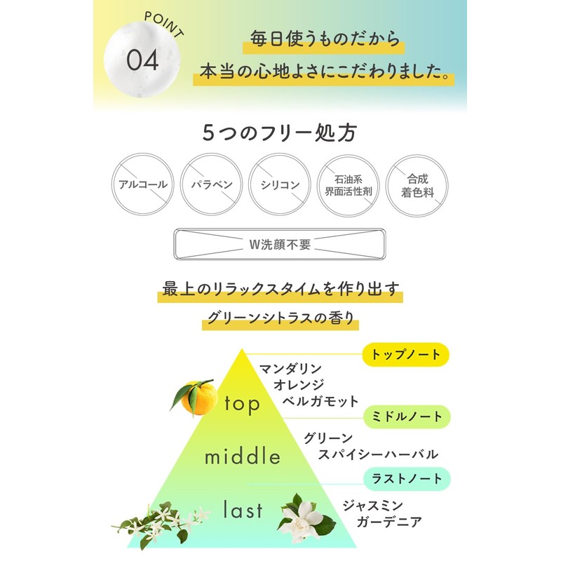 - Alcohol free, paraben free, silicone-free, petroleum surfactant free, synthetic coloring free and carefully designed No need to wash your face. Green citrus scent