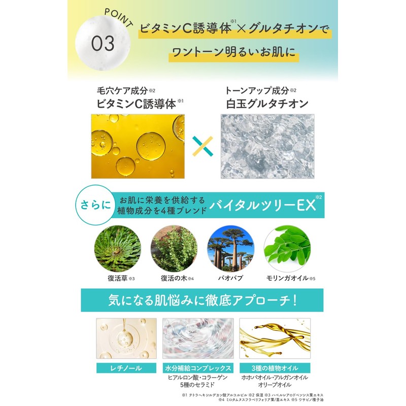 - Vitamin C derivative x Glutathione. The synergistic effect of vitamin C derivatives and glutathione increases the moisture density of your skin, and leaves your skin less visible and clear. A luxurious blend of retinol, hyaluronic acid and collagen