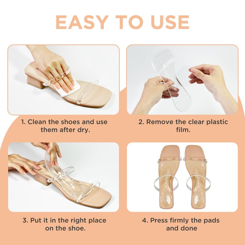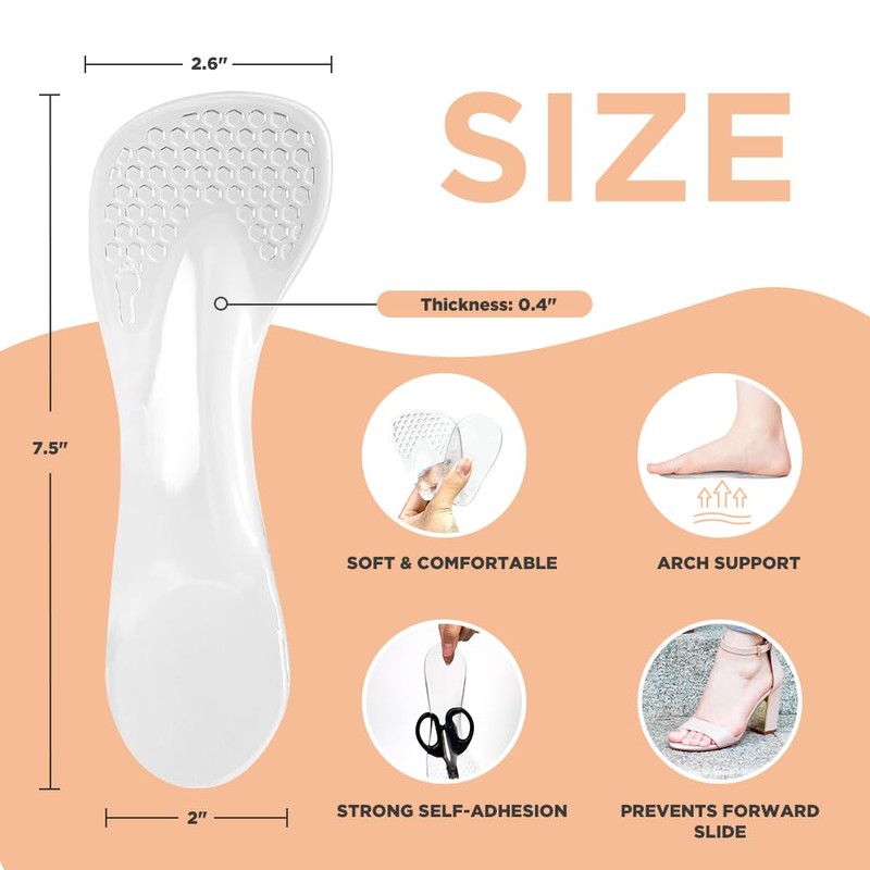 Unribeau 3/4 High Heel Cushion Insoles, Self-adhesive Arch Support Inserts for Flat Feet and Arch Pain Relief, Gel Shoe Inserts for Sandal, Flats and High Heels (2 Pairs, Transparent, Women's 5-9)