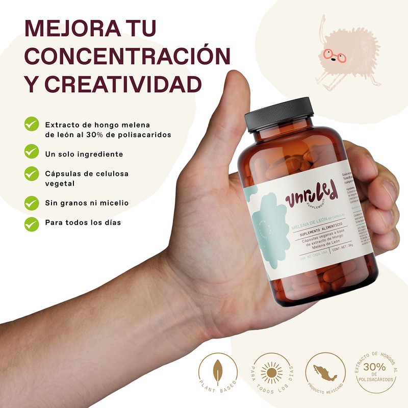Tienes que probar el hongo Melena de León de Unruled. Te ayudará a concentrarte mejor durante todo el día y sentir la mente con más claridad y ligereza. El extracto de hongo Melena de León es un ingrediente natural que tiene la capacidad de aumentar la función cognitiva. Te ayudará a tener mayor concentración por más tiempo para que todas esas tareas creativas o difíciles en el trabajo, en tus estudios y en tu día a día sean más fáciles de superar. Nuestras cápsulas veganas contienen extracto de hongo Melena de León concentrado al 30% de polisacáridos, lo que garantiza que obtendrás la máxima potencia y efectividad en cada dosis. Cada envase tiene un contenido neto de 30g, equivalente a 60 cápsulas de 500mg cada una. Te durará un mes. Llévalo contigo a todos lados. No esperes más y descubre cómo un mayor enfoque puede marcar la diferencia en tu vida. ¡Toma el control!