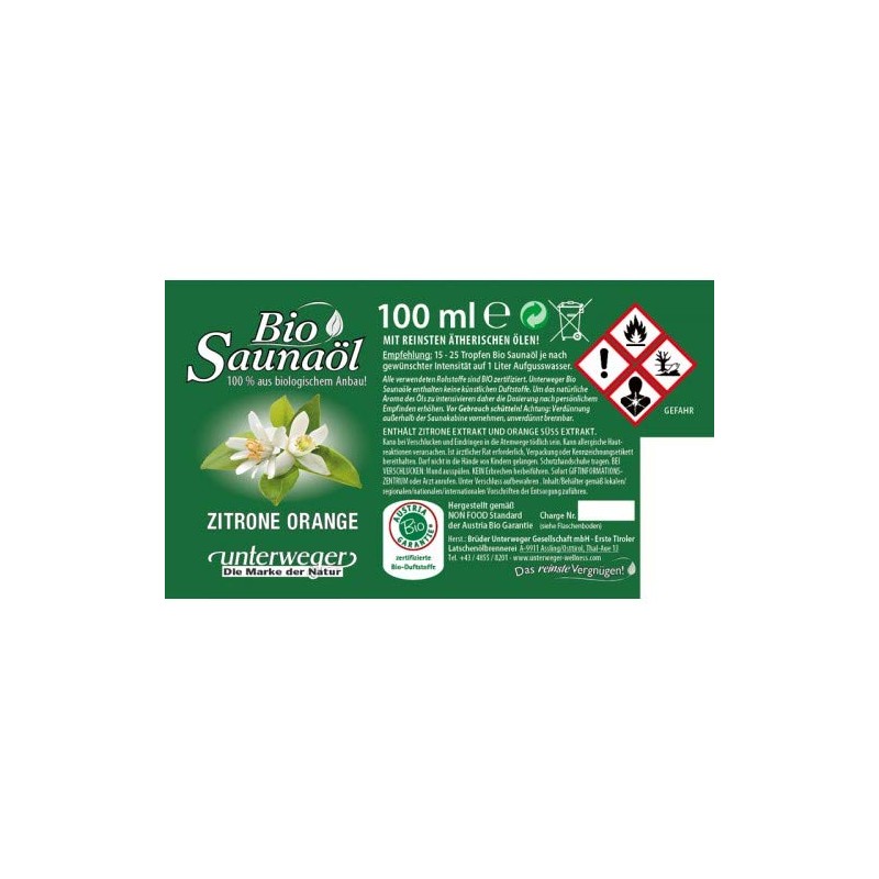Organic sauna oil lemon orange from organic cultivation, 100 ml from Unterweger, the brand from nature. The organic sauna oil is made with guaranteed pure essential oils. Contains orange oil and lemon oil. Naturally nourishing and certified by Austria organic guarantee