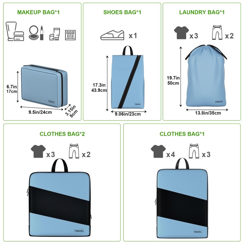 - 【ITEMS INCLUDED】Compression Bag L ✖1(16.9"*12.6"*3.5") Compression Bag M ✖2(13.7"*12.2"*3.5") Shoes Bag✖1(17.5"*9.2") Laundry Bag✖1(20.6"*14.3") Toiletry Bag✖1(9"*6"*3")