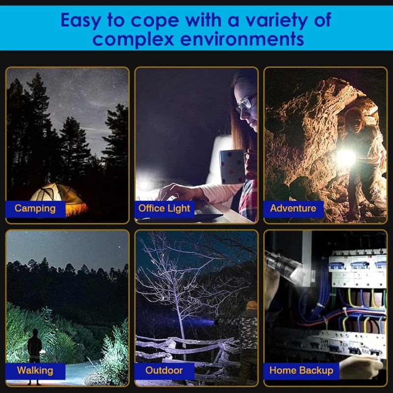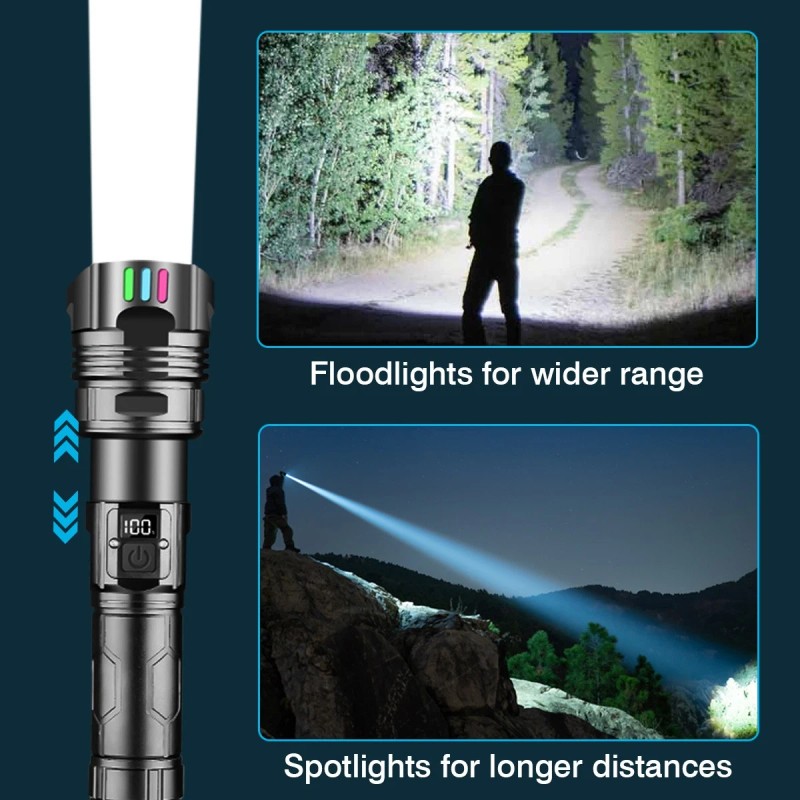 【HIGH LUMENS】With ultra-bright 30W LED chips, which can reach 1200000 high lumen, 30 times brighter than ordinary flashlights, and can easily illuminate entire rooms and backyards, or focus on objects beyond 3280FT.
