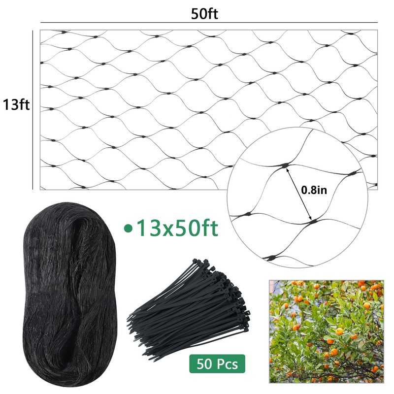 The size of the bird netting is 13 x 50 ft, and the size of the mesh is 0.8 in. Letting in the sunlight, water and air.