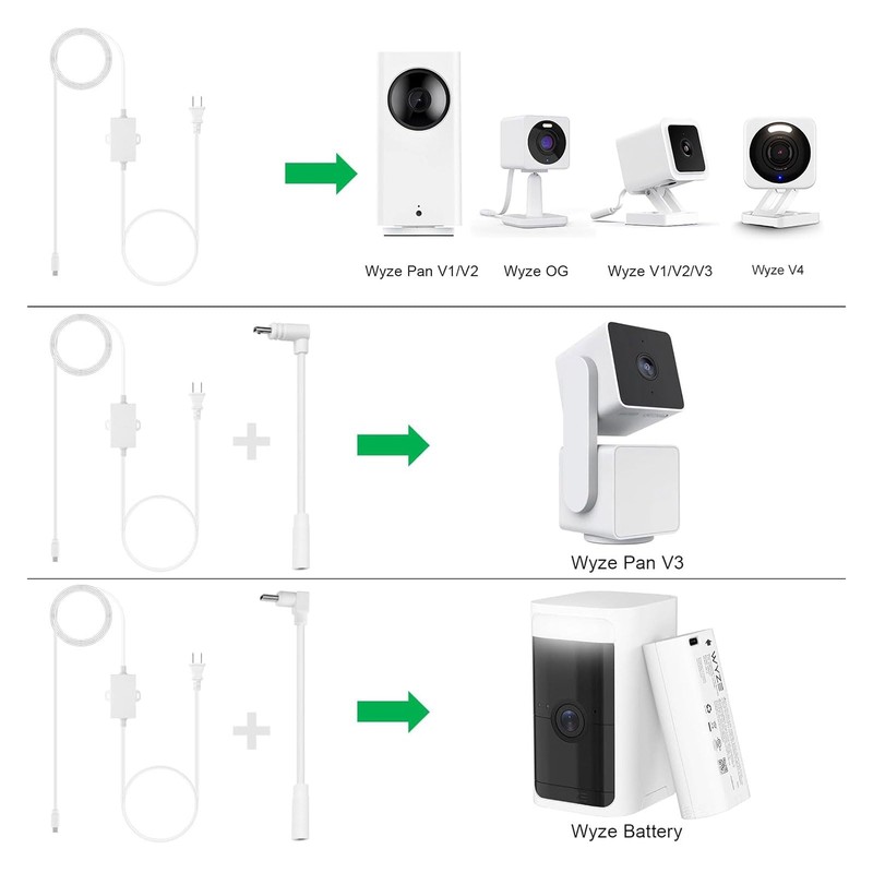 - 【Unique Design】: This Outdoor Power Adapter cable is specifically designed for Wyze Cam v4,Wyze Cam Pan v3, Wyze OG, Wyze Cam Pan v2,Wyze Battery cam,Wyze Cam v3 and v3 Pro, perfect fit between the camera and the wall socket.(NOTE:All Cam not included.)