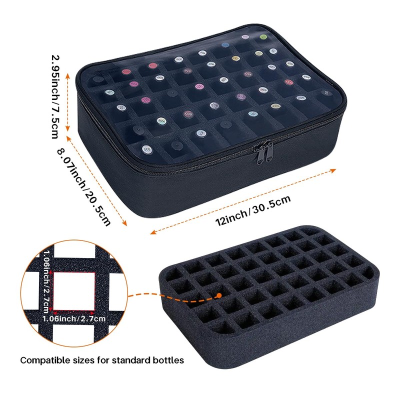 - 【Multi functional nail polish storage box】 this nail polish storage box can not only place nail polish, but also serve as a convenient makeup kit after taking out the detachable foam plug-in. Each spot for a bottle has a removable foam plug(This is used to provide stability and protect the box from deformation), and you can cut the partition between them to customize the appropriate size