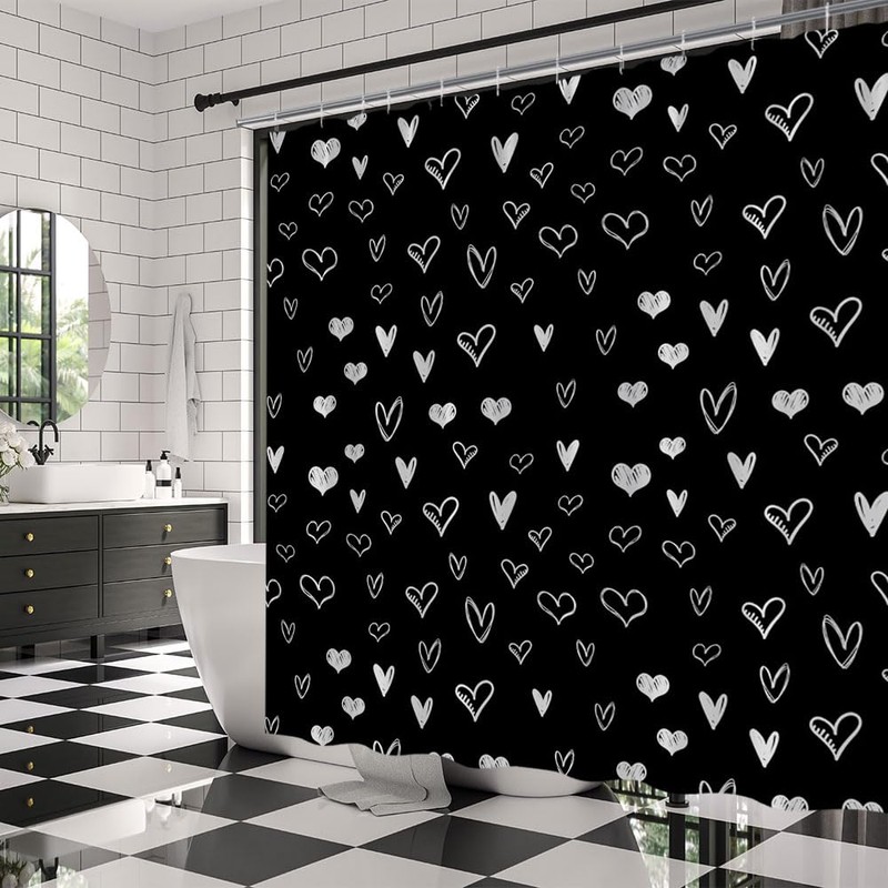 - 1. Creative and modern design: Featuring a black and white heart pattern, this shower curtain adds a touch of romance and love to your bathroom decor, perfect for Valentine's Day celebrations.