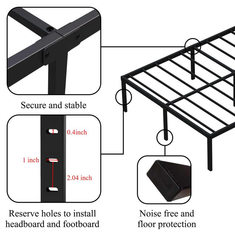 - Headboard and Footboard Compatible: You can easy to attach your own style headboard and footboard(not included) to this black metal bed frame where have some drilled holes on 6 legs.