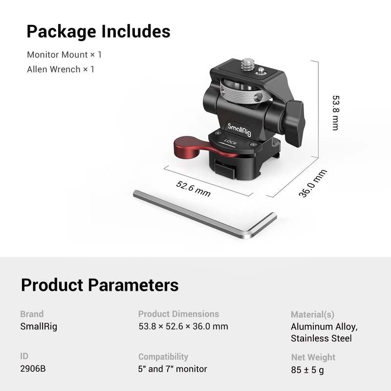 SmallRig Rotatable and Tilt Monitor Mount with NATO Clamp Mount 2906 is designed to hold your monitor for easy monitoring. It fits a standard NATO rail for quick release and comes with a top 1/4"-20 screw for monitor, microphone, light etc. The holder can be tilted 180° and swivelled 360°. Its tilt axis quickly tightens via a knob to suit different weights and features tested durability, with the tilt load capacity decreasing by no more than 20% after 10,000 inclinations, while its swivel axis is 360° adjustable via an Allen key. Bouncing positioning pins on the top help secure for Ninja V/ V+. The thumb screws have holes for Allen keys to facilitate assembly and disassembly.