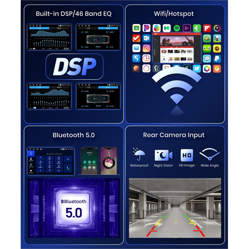 - 5.【FM/RDS Radio & DSP 32EQ】 This multimedia car video player is equipped with FM/RDS radio functions and Bluetooth system. Network Radio cover more than 20 countries and regions,high-end radio chip,powerful noise reduction and anti-interference ability.Besides,built-in Hi-Fi/DSP audio and 32 EQ,a variety of music effects for you to choose, Car bluetooth radio allows you to enjoy a live concert-like sound effect