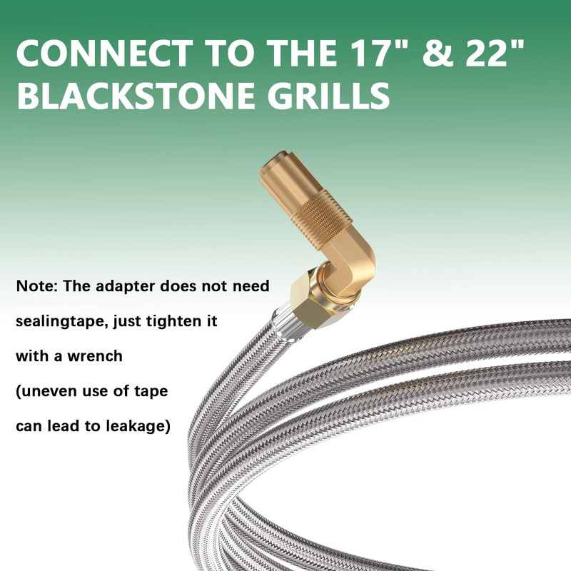 • 【Standard Connector】Type-1/QCC-1 tank connect, suitable for all Type 1 connection appliances. 3/8" female flare swivel nut fitting with outside 5/8" diameter for mounting flare seat. Come with 90 degree solid brass propane elbow adapter, you can connect it directly for blackstone tabletop grill 17"/22" hose camper grill. You can take off 90 degree elbow adapter, connect it to other brands griddle with 3/8" Male flare. Another side on the hose is QQC1 hose, connect to 5lb or 40lb gas cylinder.