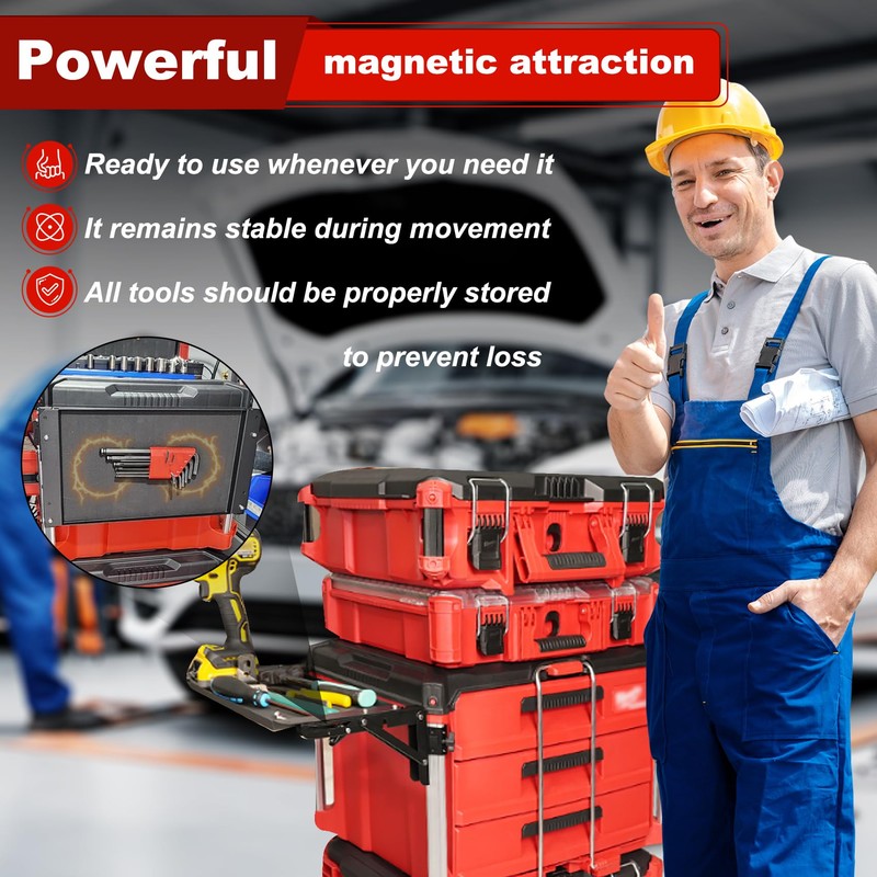Upgrade Folding Magnetic Table Compatible with Milwaukee Packout Toolbox Side Storage, Powerful Side Tool Tray Attachment for Packout System, Black Anti-Rust Coating, Aluminum Steel Frame