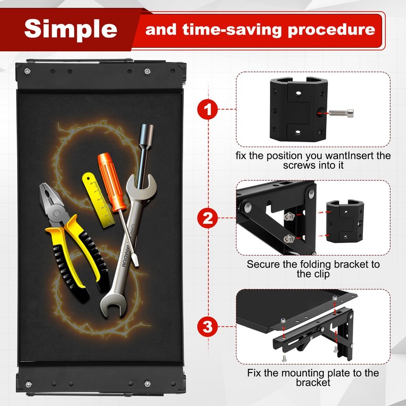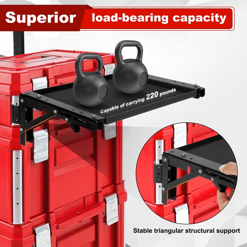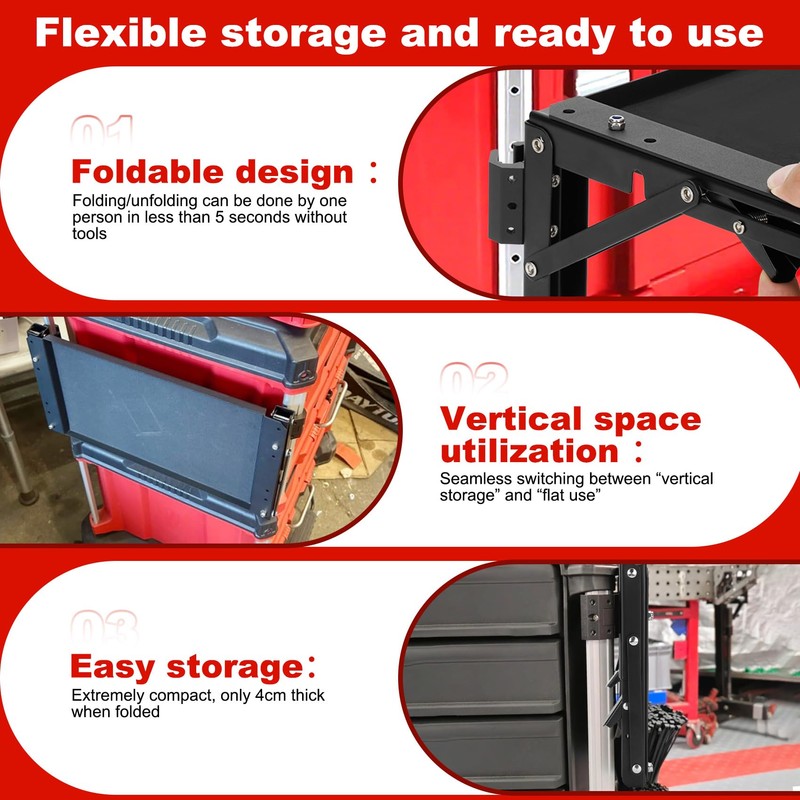 - Foldable design: Compatible with Mil.waukee toolboxes, the side storage system features a foldable design that can be easily installed on the left or right side of the box using high-quality metal threaded inserts. It can be easily folded when not in use or when passing through narrow passageways, keeping the work area tidy and allowing for flexible movement in various work scenarios. It further saves storage space while allowing tools to be transported together with the workbench, avoiding the hassle of carrying them separately