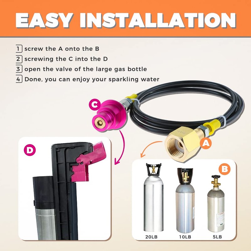 - 【WIDE APPLICATION】:The Soda DUO Machine Co2 Adapter Hose can be connected to large CO2 tanks such as 5lb, 20lb or 50lb CO2 tanks. It is suitable for use with the CGA-320 tanks in these countries - USA, Canada, Brazil, Colombia, Philippines.