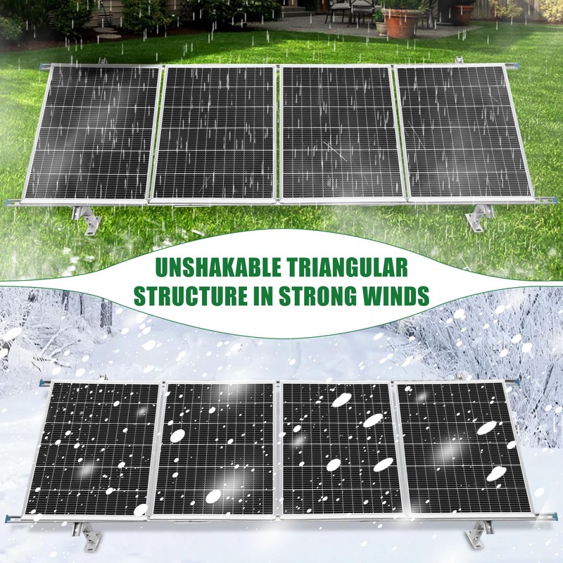 • VERSATILE SOLAR PANEL RACK:The solar panel bracket has an adjustable Angle range of 30° to 60°, so you can choose the right Angle according to the season or installation location to maximize sunlight exposure and improve energy efficiency.