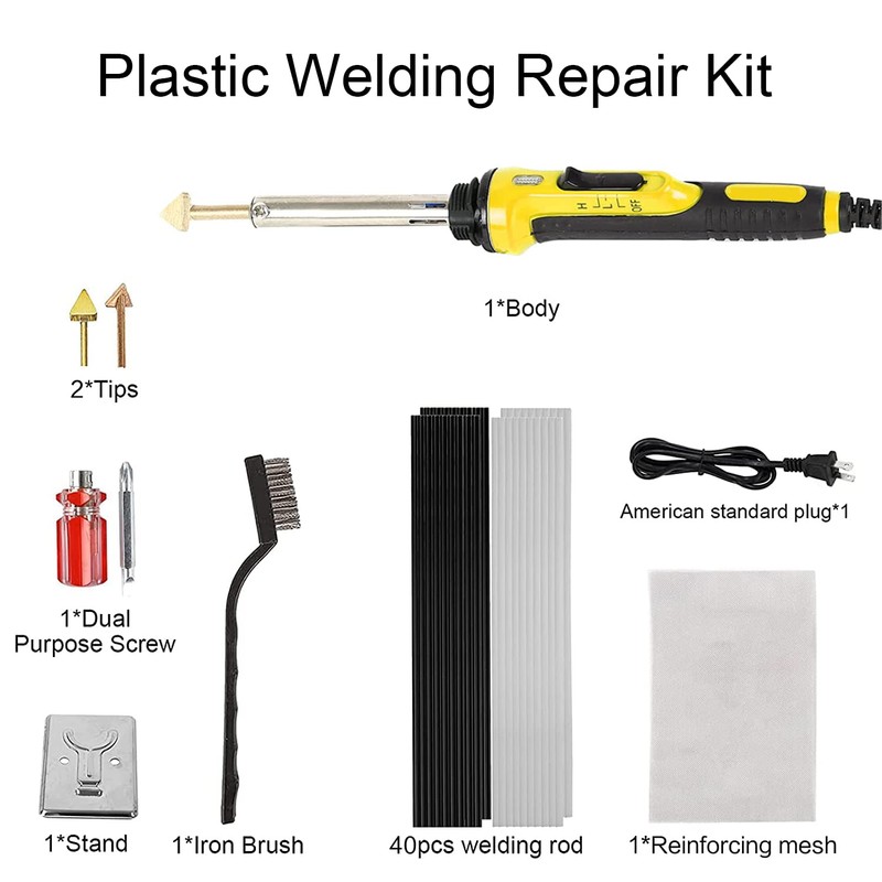 - 【Package Included】1 plastic welder, 1 metal brush, 1 metal stand, 1 stainless steel mesh, 1 screwdriver, 2 solid copper tips, 20 black plastic rods and 20 white plastic sticks.