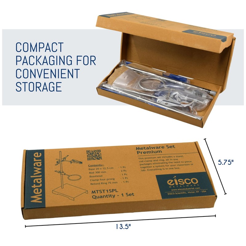 - UPGRADED SETUP || This laboratory set includes retort base made of corrosion resistant, powder coated steel, a stainless steel rod featuring a 10mm x 1.5mm metric thread, a support ring and a four-pronged cork-lined clamp. This comprehensive set now features a two-piece stainless steel rod that effortlessly screws together, ensuring easy setup and enabling more compact storage when not in use