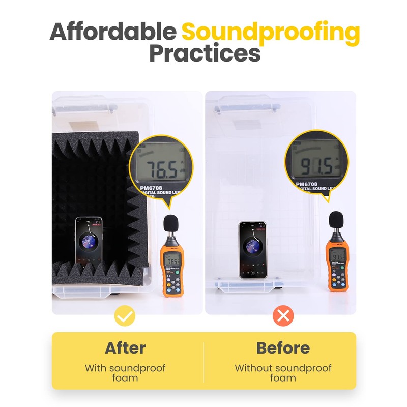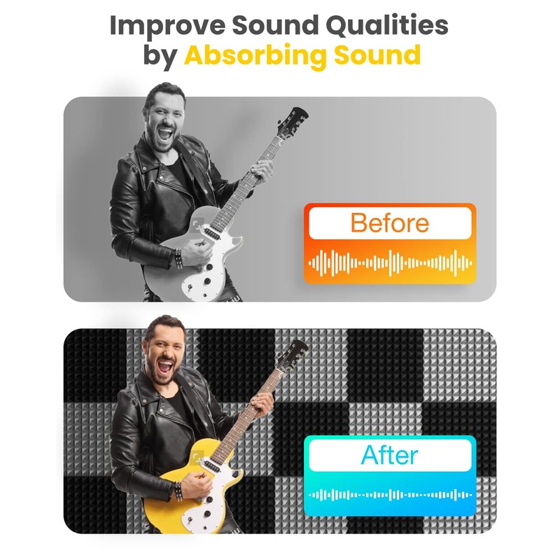 - Superior Sound Absorption: Designed to create a tranquil environment, our acoustic panels feature a pyramid design that reduces echo and noise, ensuring clear audio in any space. As the number of soundproof wall panels increases, the noise level decreases, making it easier to create a serene environment. They are ideal for homes, professional recording, streaming and sound sensitive environments.