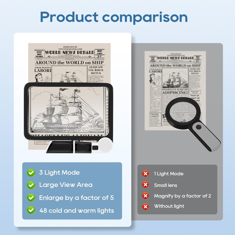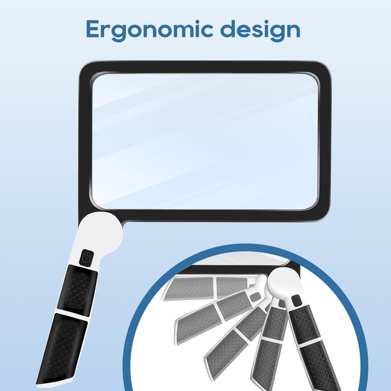 - [Foldable Handle – Lightweight & Portable] Weighing only 0.29 lbs, this magnifier features a collapsible handle for compact storage. Use it as a handheld or stand magnifier anytime, anywhere—perfect for home, travel, and libraries.