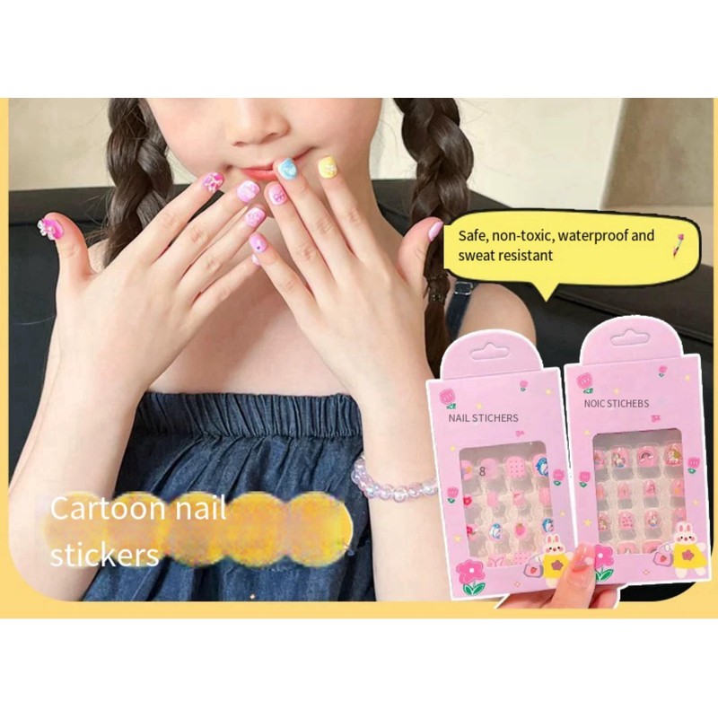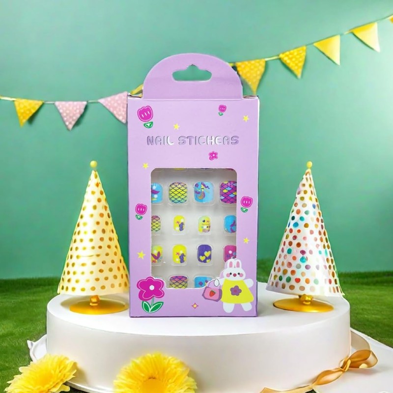 "Product Description: Fun & Easy DIY Press-On Nails for Kids This children’s press-on nail set includes 4 boxes with a total of 96 nail pieces. Each nail features cute designs and vibrant colors, allowing kids to create new styles daily, perfect for parties, birthdays, and special occasions. Ideal for girls aged 3-12, it’s a fun and creative gift choice. Safe, Lightweight & Comfortable Made from high-quality, non-toxic ABS material, our nails are BPA-free, lightweight, and breathable. They’re designed to be gentle on children’s sensitive nails and skin, offering a safe, long-lasting, and vibrant manicure without any discomfort. 12 Sizes for a Perfect Fit Each box contains 12 different sizes, making it easy to find the perfect fit for any child aged 3-12. These nails are suitable for everyday wear or special events, allowing for a customizable, stylish look. Durable & Snug Fit Our enhanced formula ensures strong anti-breakage support. Each nail is designed to fit naturally along the nail’s curve, providing a secure, waterproof fit that stays in place for extended wear. Upgraded Accessories for Extra Hold The set includes a nail file, cuticle stick, and 12 sizes of jelly glue to ensure better adhesion and longer wear. The upgraded jelly glue adds extra stickiness, preventing the nails from falling off easily. How to Use: Prepare Your Nails Remove any moisture or oil from your nails to improve adhesion. Apply the Nails Select the right size, press the nail onto your natural nail, and hold for 5 seconds. If needed, trim or file to fit. Easy Removal Soak the nails in warm water for 2 minutes for easier removal. Avoid pulling them off abruptly to prevent marks on your nails. Clean any residue with water if necessary."