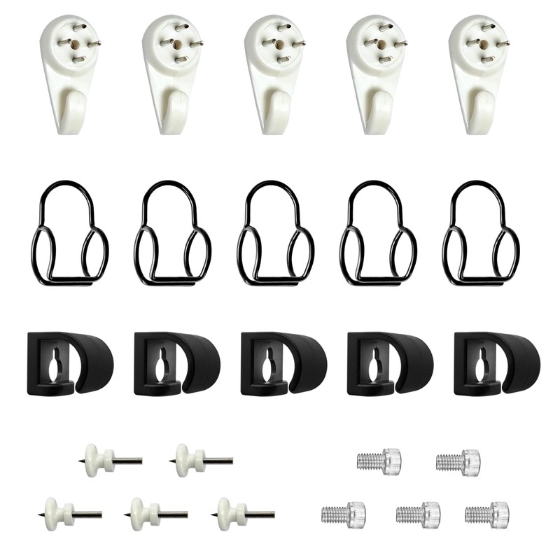 • 5 wall-hooks, 5 metal hanging buckles, 5 wall hanging rod holders , 5 traceless nails, 5 screws