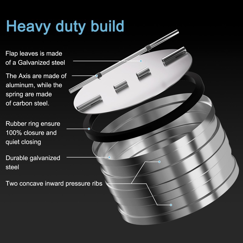• 【Lightweight valve wings】The valve wings open under the pressure created by the airflow; when the air flows in the opposite direction, it is automatically closed under the action of the spring, so as to cut off the flow. Rubber ring ensure 100% closure and quiet closing.