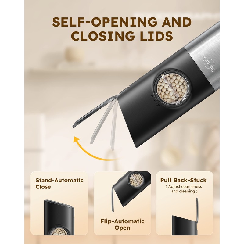 - ✅ [AUTOMATIC DUST LIDS] Enjoy hassle-free and mess-free grinding with Sangcon salt and pepper shakers set electric. Our innovative self-opening and closing lids can be operated with just one hand and effectively prevent dust and debris from contaminating your spices. The lids automatically open when the grinder is turned upside down and close when turned right side up. The lids can also be easily fixed in place for cleaning and coarseness adjustment.