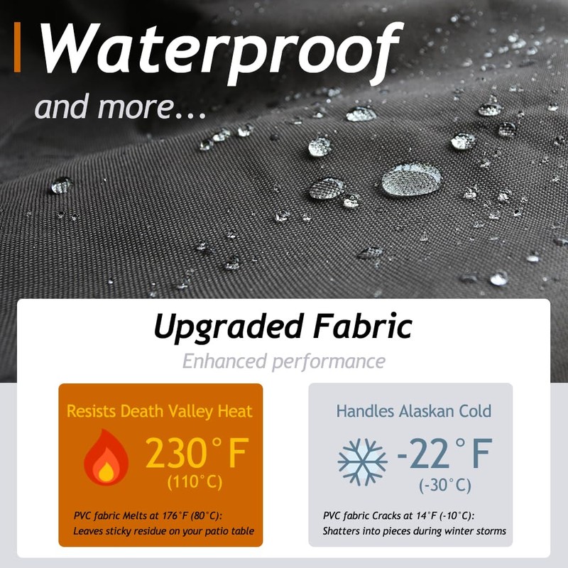 - Upgraded Premium PU Fabric for Complete Coverage and Protection --- Our outdoor sectional cover now features upgraded premium PU fabric. It's not only highly resistant to high temperatures, preventing the cover from melting onto your expensive patio sectional sofa, which is extremely difficult to clean. Also, it withstands low temperatures well, avoiding brittleness that could cause the cover to shatter and leave a mess in the wind. This cover keeps your costly furniture dry and safe, protecting it from wind, rain, frost, UV rays, dirt, dust, bird droppings, tree sap, and small animals. Ideal for your patio furniture covers needs.
