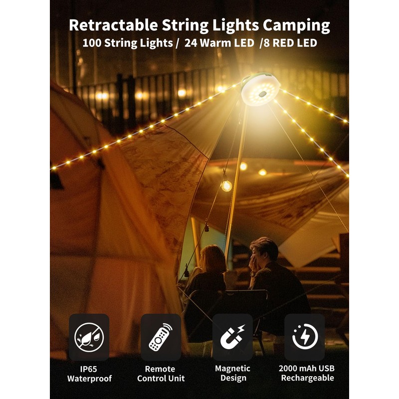 - MULTIPLE LIGHTING MODES: String lights for camping provide 8 modes, 2700K color temperature, ideal for camping tents, family gatherings, and other occasions; camp light and tent string lights can be turned on at the same time; 100lm; camp lights can also be used separately. More usage scenarios waiting for you to develop and play, what a fun gift for campers