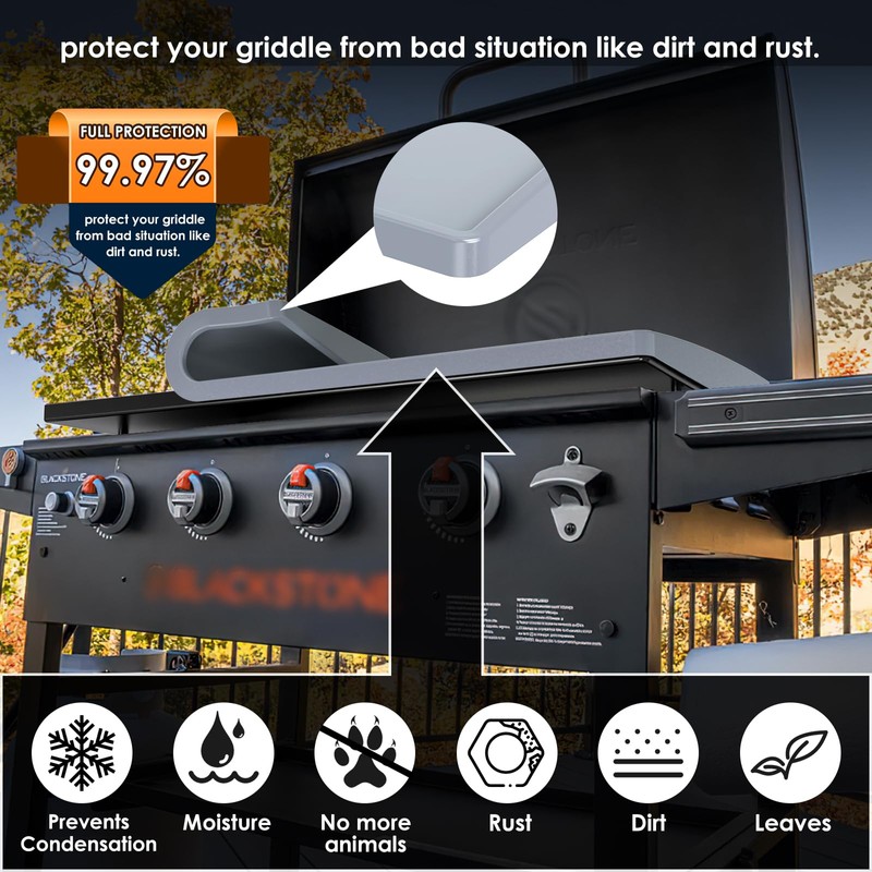 - Prolong Griddle Lifespan:After grilling ,you simply use this full coverage Blackstone cover to cover your griddle,to protect your griddle from moisture,oxygen,rust,insects and leaves.Extend the life of your wok by keeping the griddle surface clean and tidy when not in use.You can keep it on your griddle all year round, no matter the weather conditions that protect your griddle.