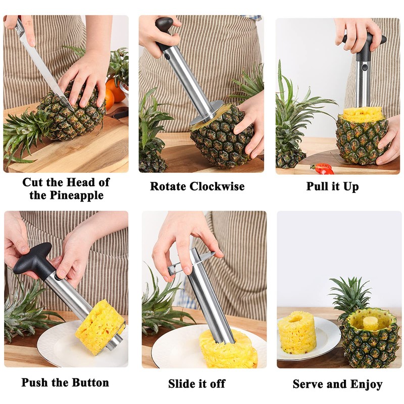 - 【EASY TO WASH AND USE】 -- First attach the handle to the slicing machine, remove the pineapple's top, and then twist the cutter into the pineapple. You get fresh pineapple pulp without peel. Easy to clean.
