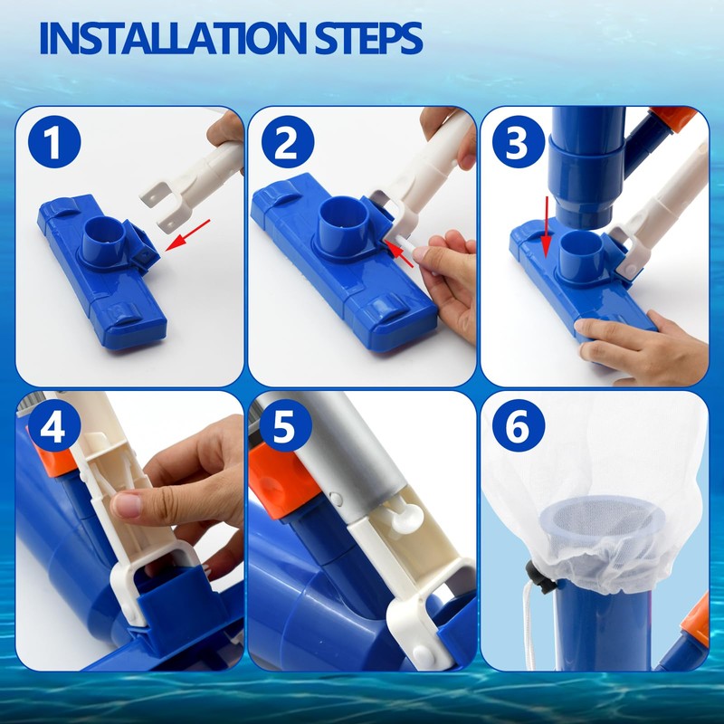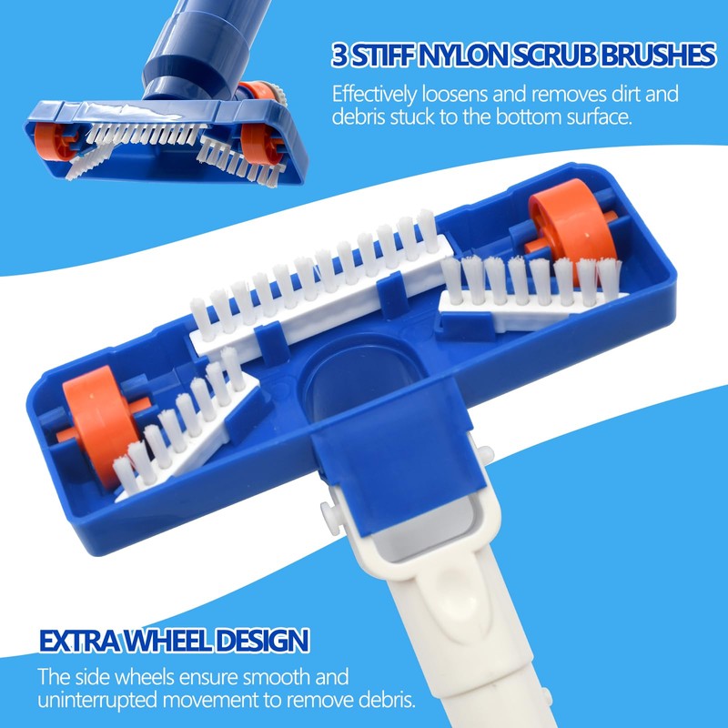 - - Comprehensive Cleaning Kit: Each kit includes a pool vacuum head with 3 scrub brushes, a mesh bag for debris collection, a 4-piece extension pole, and universal EZ clips. With easy assembly in just 3 minutes, this kit is designed for efficiency and convenience, making pool maintenance a breeze.