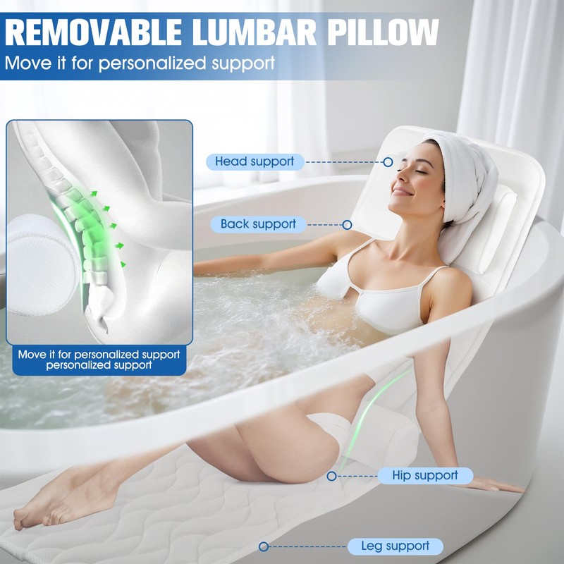 - Extra Adjustable Roll Pillow:Our luxury full-body bathtub pillow features a soft, adjustable lumbar cushion designed to deliver exceptional comfort and firm support for your waist.This detachable cushion can be freely repositioned to gently cradle your legs or feet, adapting seamlessly to your preferred bathing posture.Equipped with 2 suction cups on the back for secure fixation in your tub, our comprehensive bath pillow system elevates your bathing experience to a new level of relaxation.