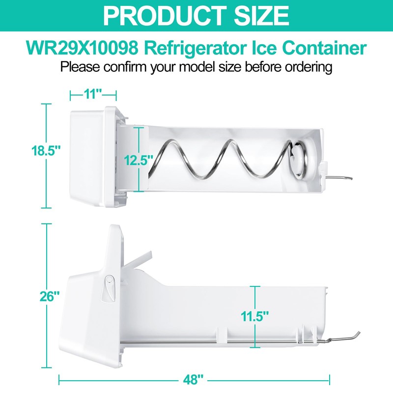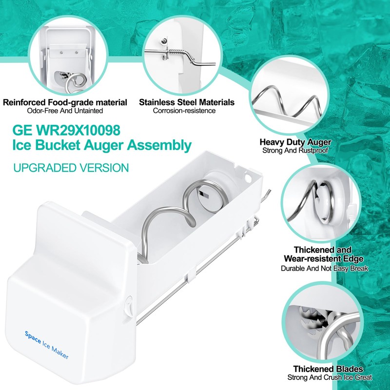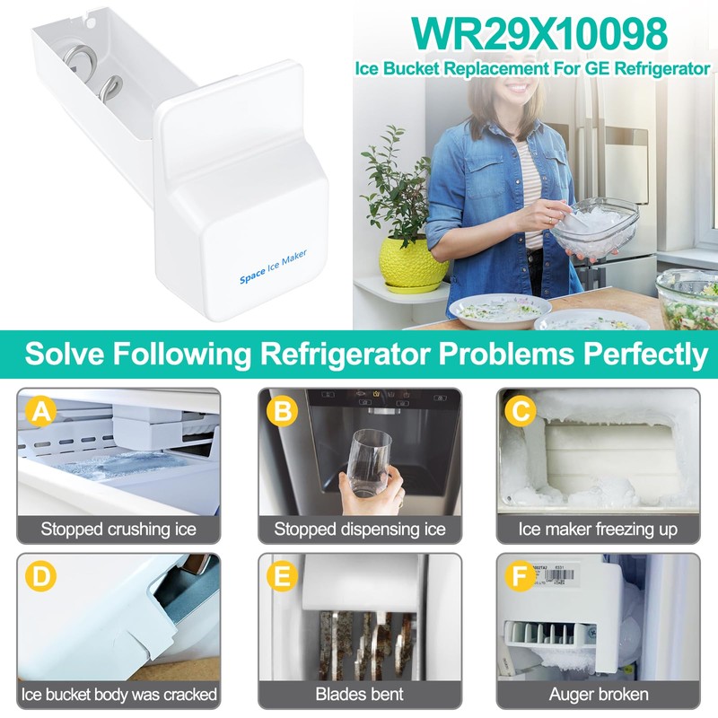 - 【Perfect GE WR29X10098 Ice Maker Replacement】 ge ice bucket container part WR29X10098 Ice Bin Replacement can solve the following problems: ➊stopped crushing ice ➋stopped dispensing ice ➌ice maker freezing up ➍ice bucket body was cracked ➎blades bent ➏auger broken ➐Ice maker mechanism kept icing up.