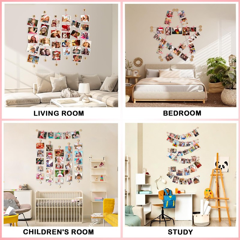 - Photo display -- This hanging instant display can show your beautiful photos. You will receive 36 clips, 12 round wooden blocks, 16 self-adhesive, traceless sticks and 10 m rope, which you can DIY in shape and size on your wall.