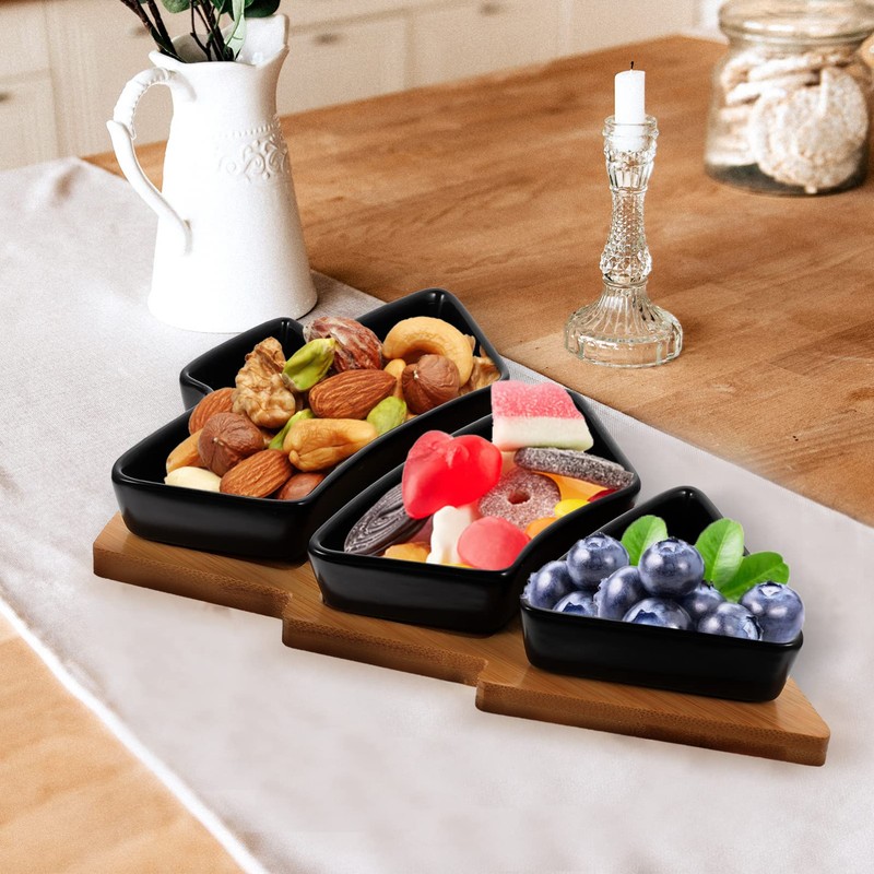 - VERSATILE USE: These ceramic snack trays are ideal for serving a variety of treats such as nuts, candy, and desserts. The set includes three trays and a wooden base, providing ample space for all your favorite snacks