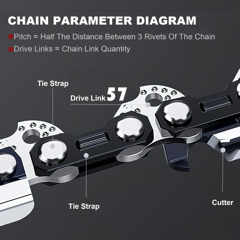 • 【Chainsaw Chain Specifications】 The size of this pack of 4 chainsaw chains is 16 inches, with 28 cutting links on each chain, totaling 57 drive links, with an approximate length of 53cm and a pitch of 3/8 inches. They are suitable for chainsaws, lithium-powered chainsaws, and small petrol chainsaws with a .050-inch gauge.