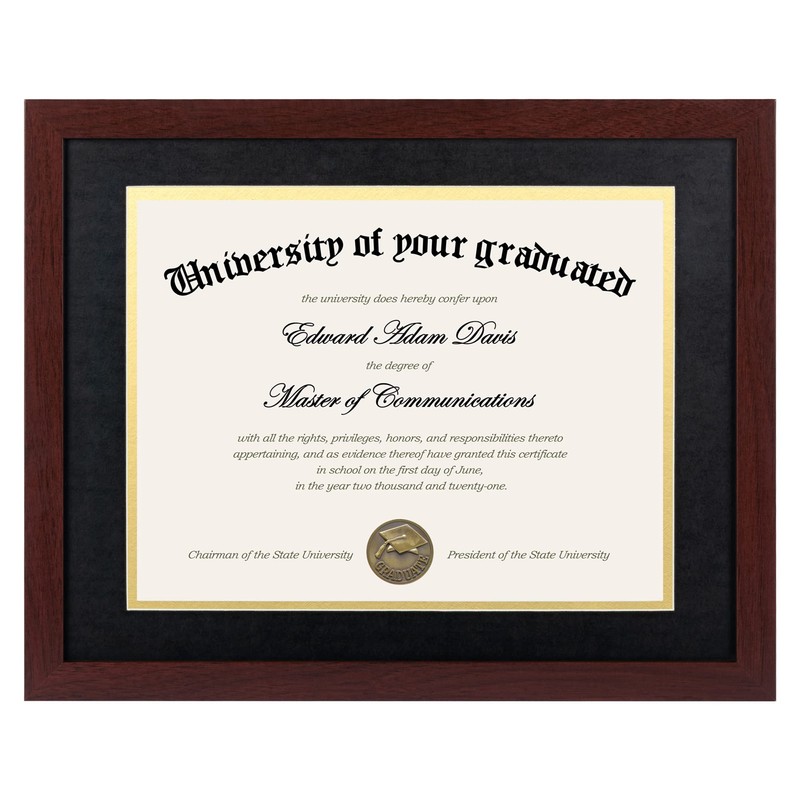 - DESIGN: Diploma Frames 8.5 x 11 with mat or 11x14 without mat. The actual mat opening is 8x10.5 inches in order to hold diploma strongly. Black picture frames with black and gold mats let diploma a clear view.