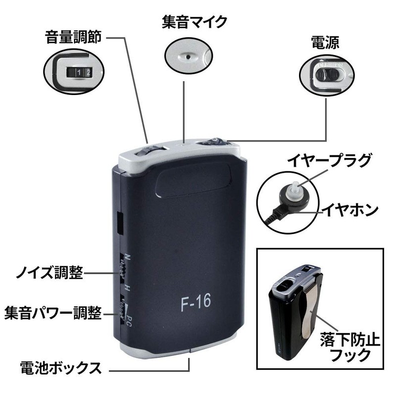 - 耳穴式や耳掛け式の集音器のハウリング(不快感を伴う音)が苦手な方には、ポケット型のイヤホンタイプの集音器がオススメです。
