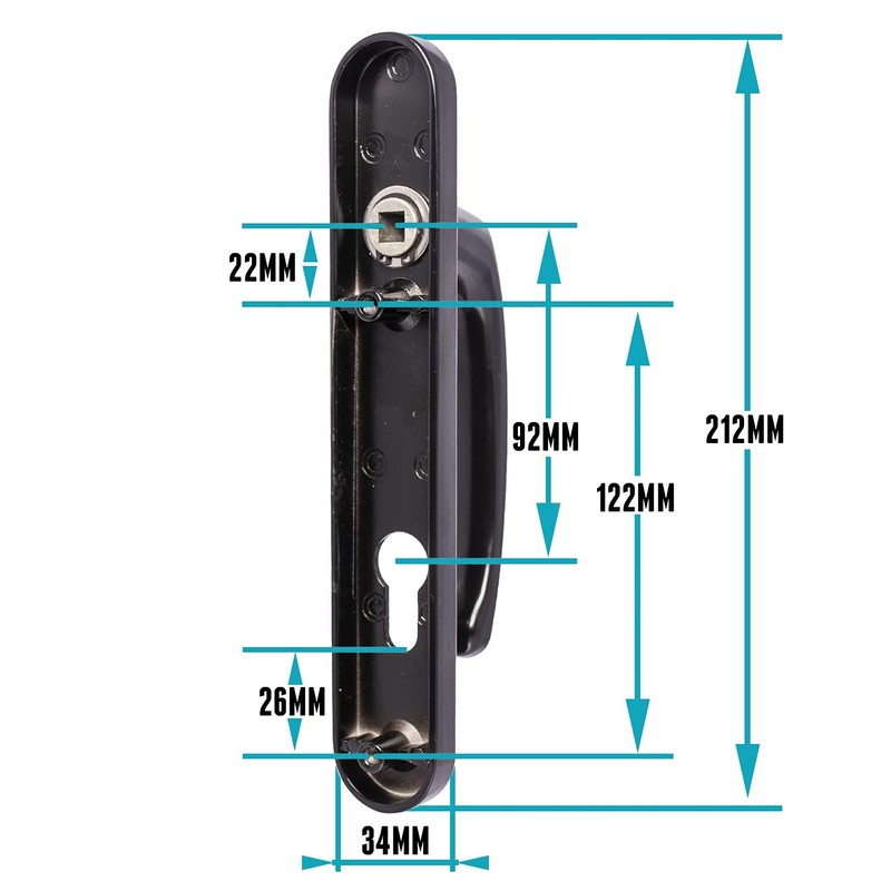 - Measurements - 122mm from Screw to Screw - 212mm x 34mm Backplate - 92mm PZ (Centres) From Centre of Keyhole to centre of Door Handle Spring - Please check these crucial measurements to ensure these Handles are suitable for you. Full Measurements are in the line drawings in the images.
