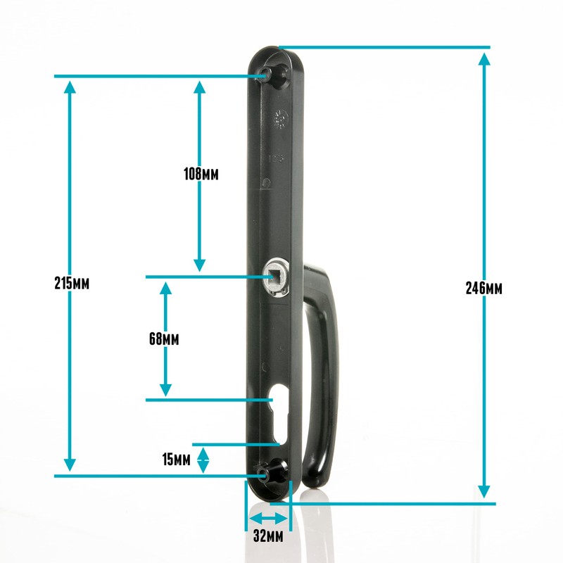 - Measurements - 215mm from Screw to Screw - 245mm x 32mm Backplate - 68mm PZ (Centres) From Centre of Keyhole to centre of Door Handle Spring - Please check these crucial measurements to ensure these Handles are suitable for you. Full Measurements are in the line drawings in the images.