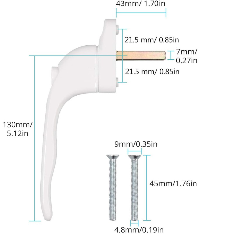- SIZE: UPVC window handle with 43mm Spindle and Fixing Screws with Cap.spindle width is 7*7mm, comes with 2 fixing screws for fitting