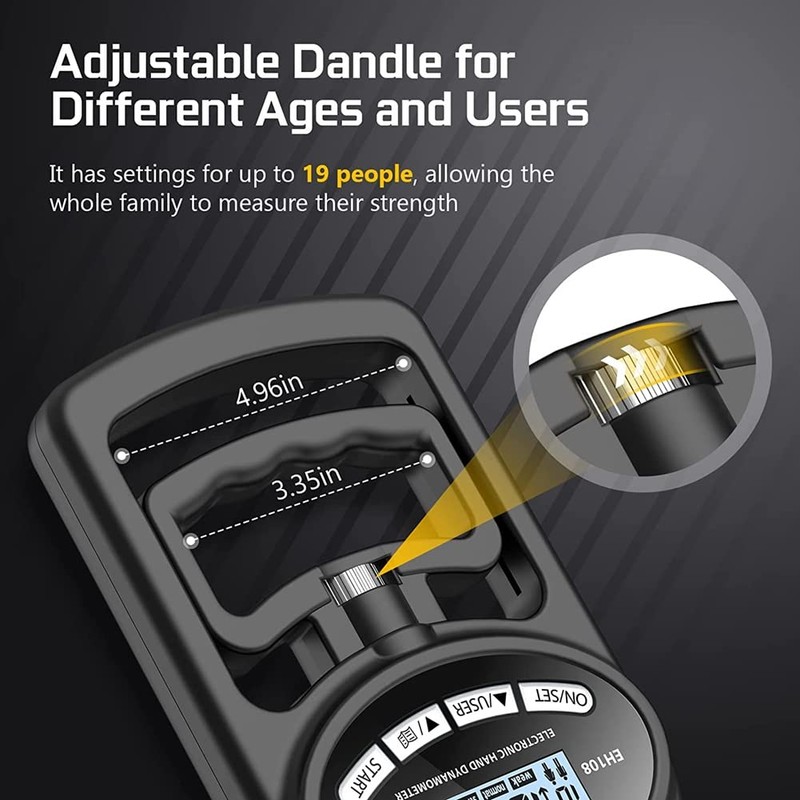 - [Easy to use] Large LCD screen of the grip strength gauge shows all measured values on the same screen. Readings displayed include user code, age, gender, grip value in pounds or kilograms, and grip status. The maximum grip value display and the power level weak, normal or can be stored and easily retrieved for comparison.