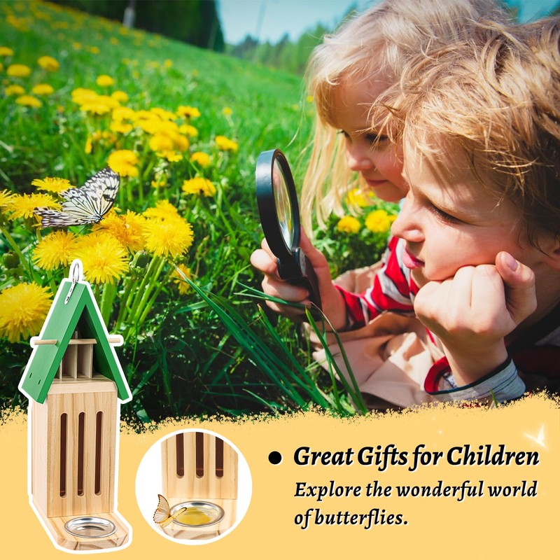 • Natural Wooden Butterfly House: This butterfly shelter is made of natural pine wood, its shape blends perfectly with nature, beautiful and durable, protecting butterflies from harsh weather. The smooth surface ensures no harm to the butterflies, creating a safe and comfortable habitat for them