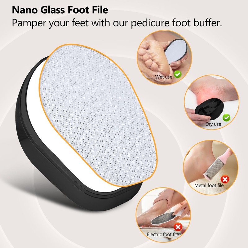 - Innovative Nano Glass Foot Scrapers: Pamper your feet with our Pedicure Foot Buffer, a must-have tool for achieving salon-worthy results at home. The ergonomic design ensures a comfortable grip, allowing you to effortlessly buff away dry and rough skin, won't cut or leave scratches or raw skin like metal foot rasps or an electric foot shaver.