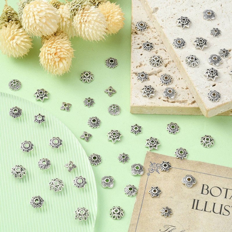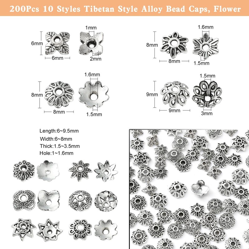 - 🌺Package Including: You can receive 200pcs tibetan silver flower bead caps, size is about 6~9.5x6~9.5x2~3.5mm, hole is about 1~1.6mm, 20pcs/style, 10 styles. Please refer to the legend for detail size and shape. All flower bead end caps are sorted in one box.