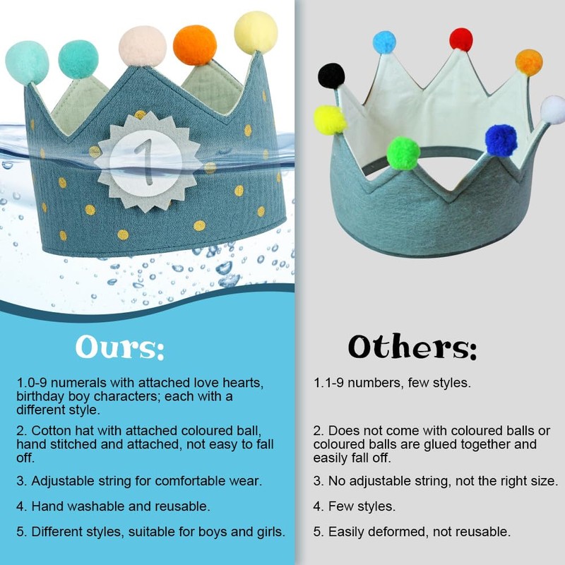 - HIGH QUALITY MATERIALS: This birthday crown is made of high quality muslin material, double layered, with a total thickness of 4mm. The texture is soft and comfortable, which is suitable for children's delicate skin.The crown is sewn very precisely